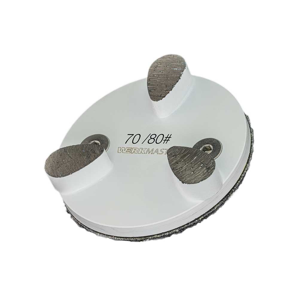 The WerkMaster 3-In. 3 segment 70/80 grit teardrop tooling handles a range of grinding needs with the Scarab handheld surface prep tool. This rental-friendly tooling attaches to the Scarab’s toolheads, and has a medium bond for most types of concrete with Mohs 4.5-7.5 hardness. This versatile tooling strips away paint, epoxy, sealers, and other coatings, and leaves minimal tooling marks on the floor. This tooling uses a polycrystalline diamond abrasive, which will hold up for a lifespan finishing up to 18,000 Sq. Ft.