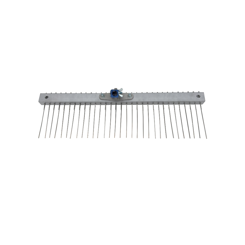 24 in. wide brush with steel tines, spaced ¾ in. apart