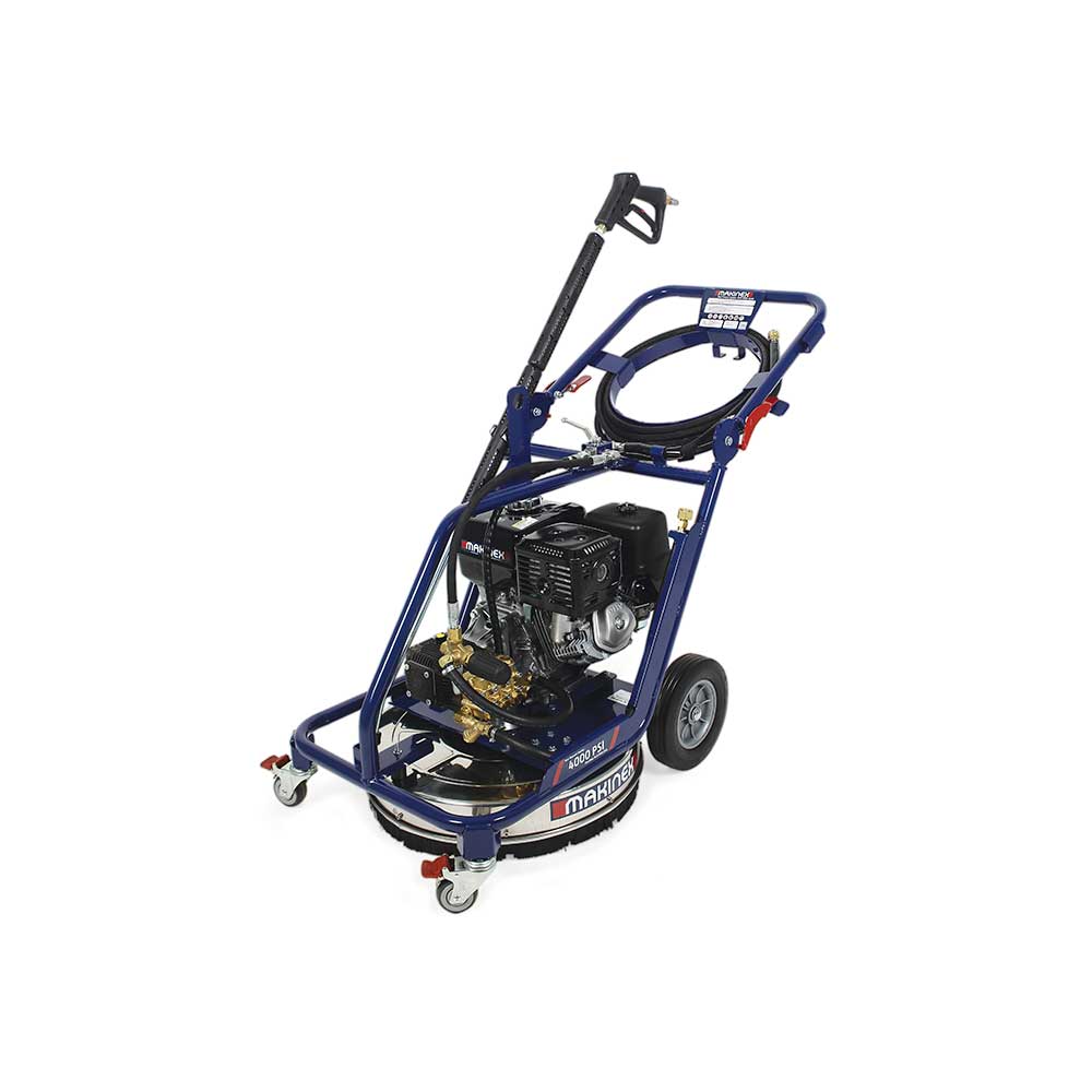 The Makinex dual pressure washer is powered by a powerful Vanguard engine, with 4.0 gallon per minute output and adjustable pressure from 1000 to 4000 PSI. This combination rotary cleaner and pressure washer eliminates the need for having two machines, and can switch between the two functions while the machine is still running. The rotary cleaner’s deck is stainless steel and 24 In. wide, and the pressure washing wand includes a 50 Ft. long high-pressure hose. The heavy duty frame is compact, with a foldable handle and front locking castor wheels for ease of transport. The pump is an AR Triplex pump, featuring gear reduction, an internal bypass unloader, and a thermal release valve.