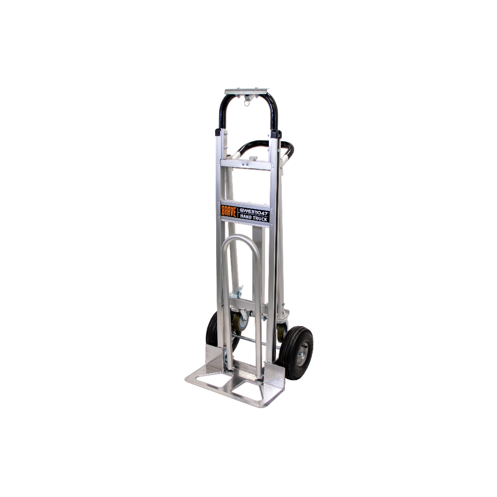 The Brave 3-in-1 aluminum hand truck is perfect for transporting a wide variety of cargo. This hand truck converts easily from 2-wheel mode with 10 in. pneumatic tires, to 4-wheel mode by adding swivel casters in the rear for added support. It can also function in platform truck mode, accommodating bulky cargo up to 770 lb. with two handles for easy steering.