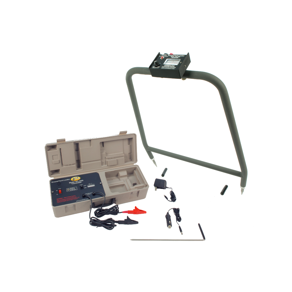 The Armada GFL300 ground fault locator is designed to find nicks and cuts in buried cables, where voltage is leaking to ground. The transmitter outputs a 2400 or 3400 VDC charge, which is then detected by the A-frame receiver to locate faults. The receiver has an analog meter, which kicks in the direction of ground faults for easy signal tracking. This locator includes car and wall chargers for the transmitter, and has easy-to-read LEDs for monitoring battery life.