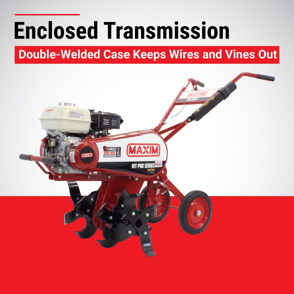 Chain drive transmission is enclosed in a double-welded case to keep weeds, vines, and other debris out while operating.